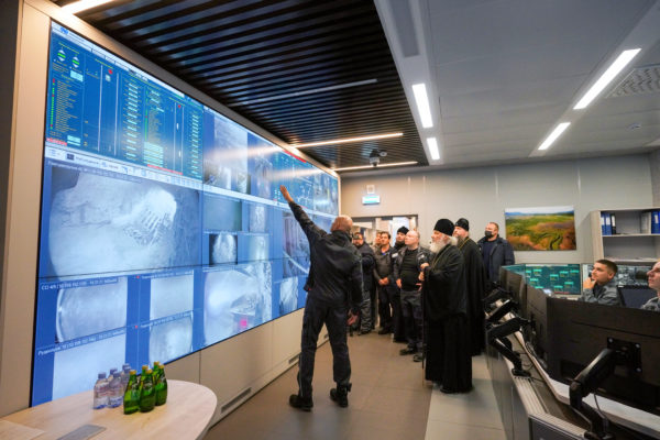 Знакомство с производством началось с административного корпуса. Святейший Патриарх Кирилл осмотрел стенды, посвященные работе рудника, а также Центр планирования, организации и контроля горных работ. Там же Святейший Владыка ознакомился с инструкциями по технике безопасности.