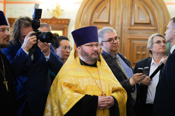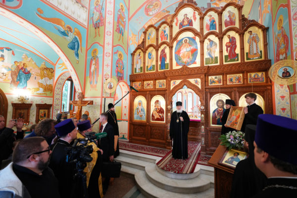 Святейший Патриарх прошел в алтарь и поклонился святыням храма, а затем с солеи обратился к собравшимся: