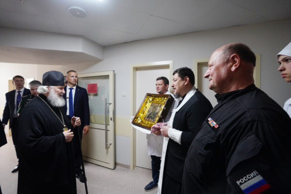 Передав в дар храму икону Архангела Михаила, Святейший Владыка направился в Многопрофильный хирургический центр, где Его Святейшество встречал заместитель начальника госпиталя по медицинской части доктор медицинских наук А.И. Павлов.