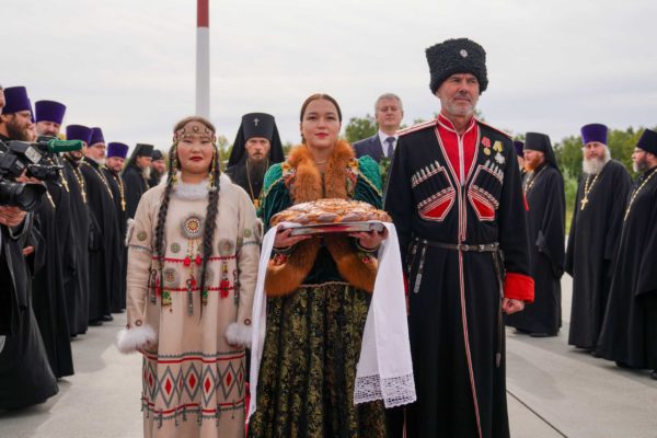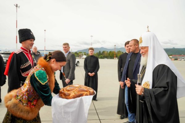 Традиционный каравай с хлебом и солью Его Святейшеству преподнесли представитель Камчатского казачества, девушка в русском национальном костюме и представительница коренных малочисленных народов Камчатки в корякском национальном костюме.