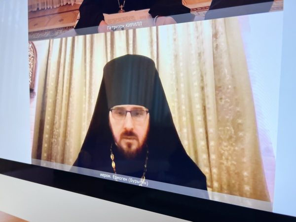 Встреча прошла в дистанционном формате. Предстоятель Русской Православной Церкви принял участие в беседе с помощью средств видеосвязи из Патриаршей резиденции в Переделкине.