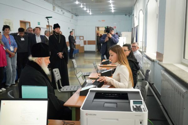 Святейшего Патриарха Кирилла встречали председатель Участковой избирательной комиссии А.В. Редин, члены избирательной комиссии.