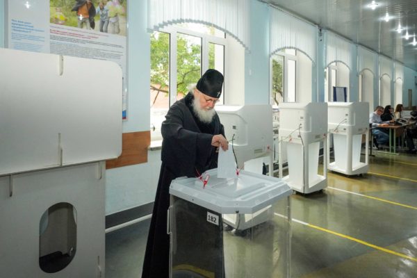 Предстоятель Русской Православной Церкви заполнил бюллетень и опустил в урну для голосования.