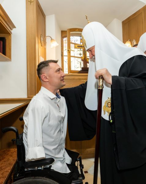 На выходе из храма Святейший Патриарх Кирилл благословил и пообщался с А.К. Талаем, членом Национальной паралимпийской сборной Республики Беларусь, мастером спорта по плаванию, многократным рекордсменом мира и Европы, в 16 лет лишившимся рук и ног в результате подрыва на мине.