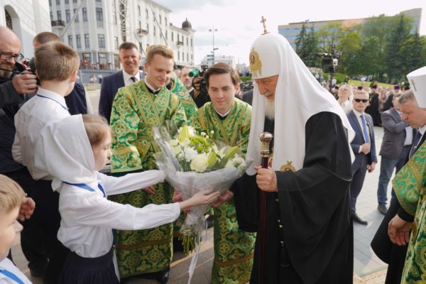 По окончании богослужения митрополит Минский Вениамин от лица епископата, духовенства и мирян Белорусского экзархата приветствовал Святейшего Владыку на Белорусской земле и преподнес Его Святейшеству Жировичскую икону Божией Матери, выполненную в камне (в этом году отмечается 555-летие явления Жировичского образа), и факсимильное издание Лавришевского Евангелия.