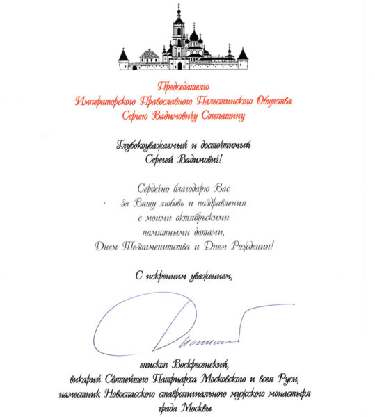 Председатель Императорского Православного Палестинского Общества Сергей Степашин получил благодарственное письмо от действительного члена ИППО, Управляющего делами Московской Патриархии, постоянного члена Синода митрополита Воскресенского Дионисия за поздравление с памятными датами владыки.