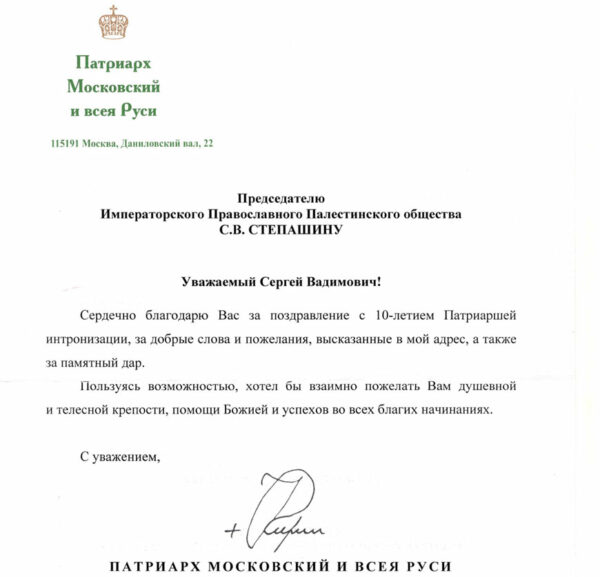 Председатель Комитета Почётных членов ИППО Святейший Патриарх Московский и всея Руси Кирилл направил Председателю ИППО Сергею Степашину благодарственное письмо за поздравление с 10-летием Патриаршей интронизации.