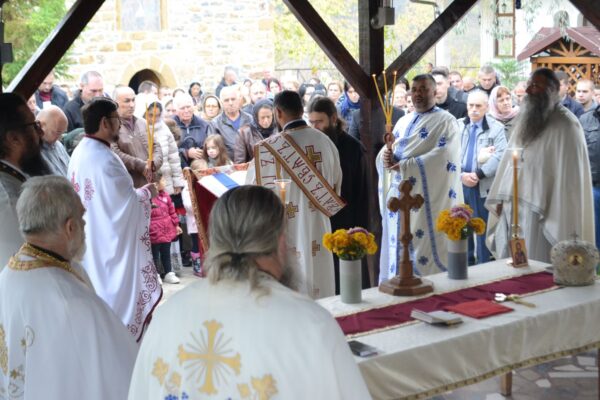 Владика је благословио славски колач и преломио га са игуманом манастира архимандритом Стефаном пожелевши њему и братији да духовно напредују служећи Богу у тој светињи рушеној и опет обновљеној и васкрслој, која данас окупља верне са свих страна уз мошти светих Врача.