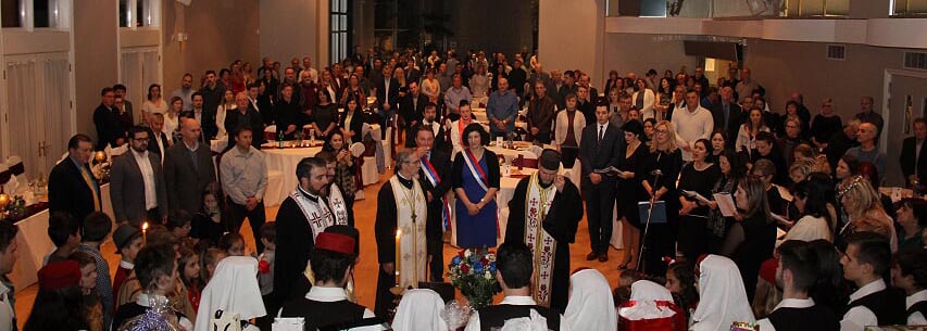 На празничној приредби наступили су ученици Српске школе Свети Василије Острошки, показујући значај и величину српског језика и културе за децу рођену ван Отаџбине. Деца из фолклорних група „Млада Србадија“ и „Вук Караџић“ угријала су срца присутних лепом и грациозном игром. Народним песмама гости су били почашћени у извођењу познате оперске диве г. Мартине Говедник и мушке певачке групе „Српски соколови“. Лепоти прославе допринели су и хорови „Обилић“ и руски хор „ е ждали“ који су изванредно извели српске и руске народне и духовне песме.