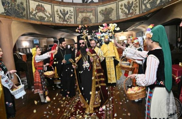 Честит съм, прекрачвайки прага на Катедралния храм „Св. Вмчк. Димитрий“ отново, като ваш митрополит да приветствам вас, епархийските съветници, архиерейските наместници, свещениците и монашествуващите, верните епархиоти – участници в радостта на това светло и духовно тържество за Сливенска епархия с радостния поздрав – ХРИСТОС ВОСКРЕСЕ!
