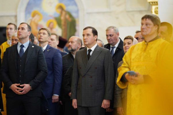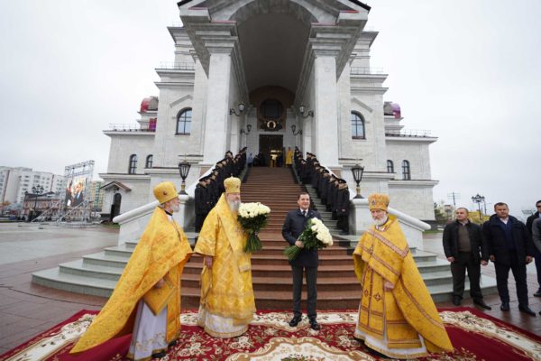 Знаком духовного возрождения Севера и явился величественный кафедральный собор, и моя великая благодарность всем — и властям, и людям, которые жертвовали деньги, и тем, кто вносил решающий финансовый вклад в строительство этого храма. И, конечно, владыка, в первую очередь Вам, потому что Вы были двигателем всего этого дела. Благодарю Вас, что Вы не убоялись, не устрашились трудностей и, невзирая на очень скромную материальную сторону, все-таки приняли решение строить храм, и мы видим, что Ваши намерения завершились таким великим, добрым и святым делом.