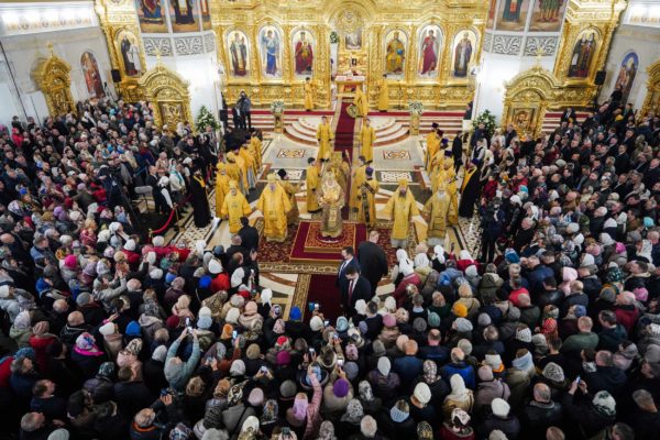 Думаю, все, что я сейчас сказал, становится особенно убедительным при созерцании этого святого храма. Построен Божий храм. Еще раз скажу: храмы строятся только тогда, когда в них есть потребность, и, покуда будет эта потребность в народе нашем, Россия непобедима. Потому что нельзя соотнести силу духа народа, который верит в Бога и любит свою Родину, с условной силой тех, кто расслабился в комфорте, забыл, что такое любовь к Отечеству, и кто движется только одним устремлением получить больше денег и получше их потратить. Очень важно, чтобы мы не утратили это духовное измерение нашей личной, семейной и общественной жизни. И еще раз хочу сказать, что этот величественный кафедральный собор является свидетельством именно такого, духовно ценного и целостного пути нашего исторического развития, который сейчас имеет место.