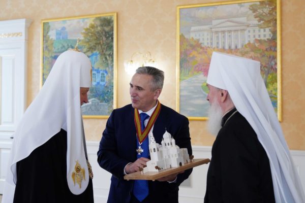 Во время встречи губернатор Тюменской области вручил Предстоятелю Русской Церкви фотоальбом с изображениями храмов региона. «Здесь фотографии большого количества больших и малых храмов, которые были построены либо восстановлены во всем нашем регионе, начиная с храмов каменного Тобольского кремля, который Вы лично могли увидеть», — отметил А.В. Моор.
