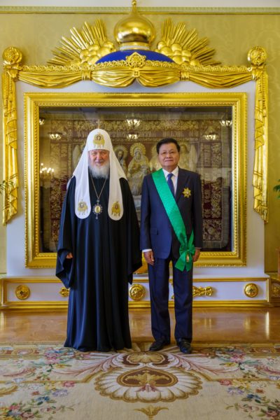 В завершение встречи Святейший Патриарх Кирилл вручил Президенту Лаоса орден Русской Православной Церкви Славы и чести I степени. Указом Его Святейшества этой награды Президент удостоен «во внимание к помощи Русской Православной Церкви».