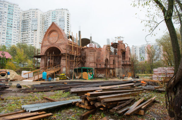 в храме Архистратига Божия Михаила в Царицыне. Здесь кирпичная кладка стен уже скоро достигнет сводов;