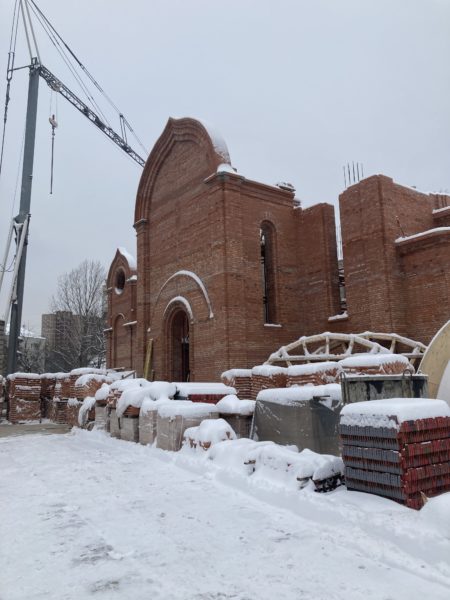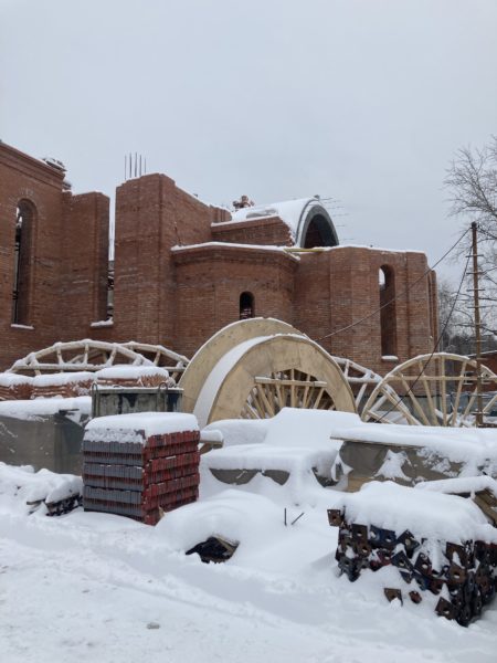 в храме Архистратига Божия Михаила в Царицыне. Здесь кирпичная кладка стен уже скоро достигнет сводов;