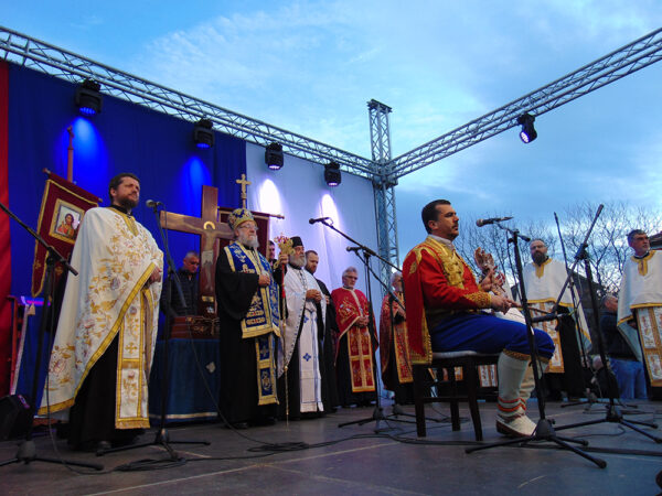 Појачка група Стара Србија, у којој су Марко Башица, проф. Јован Катић, свештеник Слободан Вујасиновић, парох сремскокарловачки, и Миодраг Близанац, освојили су верне, осоколили, ободрили их песмом (још једном до незваничних химни литија) Устала је Црна Гора према тексту Славка Перошевића за коју је г. Миодраг Близанац урадио аранжман и композицију. Народни гуслар Миљан Вујовић, председник гусларског друштва „Вук Караџић” из Врбаса отпевао је уз гусле песму „Српска Спарта”.