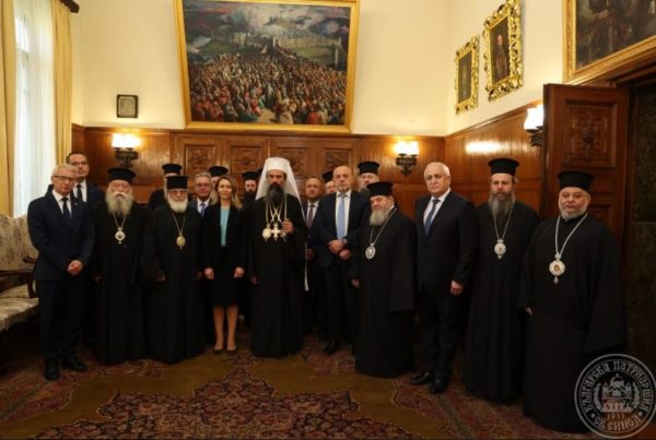 Негово Светейшество Българският патриарх и Софийски митрополит Даниил и Техни Високопреосвещенства митрополитите на САЩ, Канада и Австралия Йосиф, Великотърновски Григорий, Ловчански Гавриил, Пловдивски Николай, Западно- и Средноевропейски Антоний, Варненски и Великопреславски Йоан, Неврокопски Серафим, Русенски Наум, Старозагорски Киприан, Врачански Григорий, Доростолски Яков, Сливенски Арсений и Мелнишки епископ Герасим, гл. секретар на Св. Синод се срещнаха днес в Синодалната палата с председателя на Народното събрание Рая Назарян и народни представители от всички парламентарни групи – Томислав Дончев (ГЕРБ-СДС), Йордан Цонев (ДПС), Николай Денков (ПП-ДБ), Цончо Ганев (Възраждане), Иван Иванов (БСП за България) и Александър Александров (ИТН).