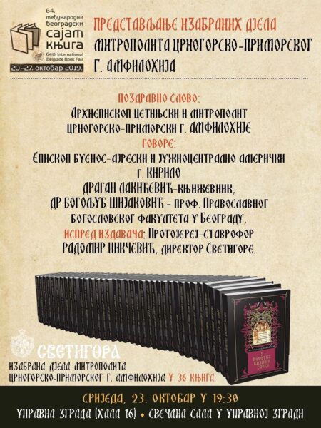 63. Међународни сајам књига биће одржан од 21. до 28. октобра 2018. године у Београду. Српска Православна Црква ће представити своја издања на штандu у хали 1. Епархије Српске Православне Цркве своја издања излужу у хали 4. Ове године Библиотека Српске Патријаршије, са благословом Светог Архијерејског Синода, организује представљање црквене издавачке делатности на Сајму књига. Препоручујемо: