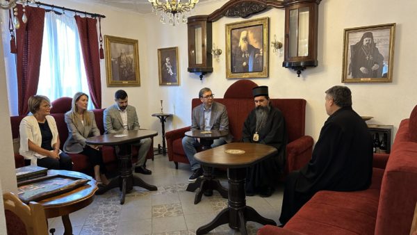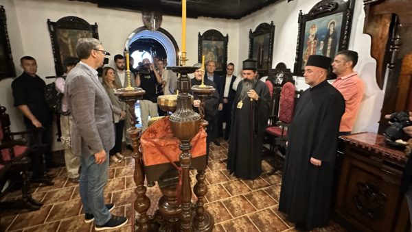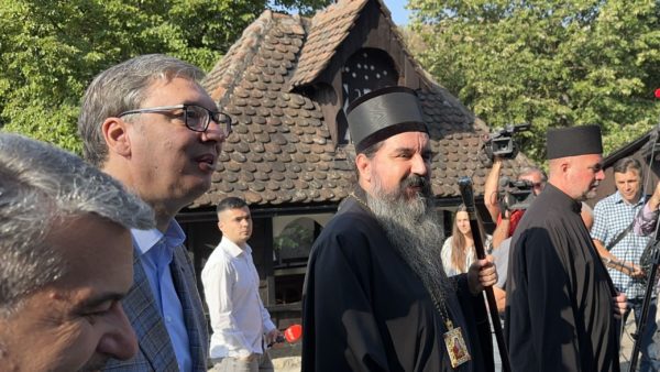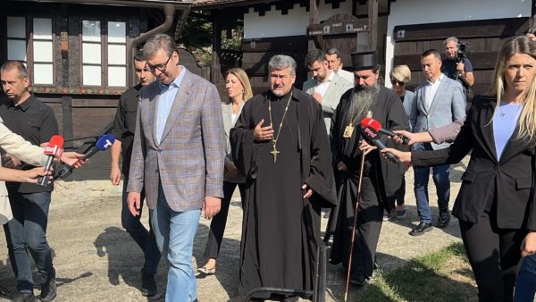 Епископ Јеротеј је пожелео добродошлицу председнику Вучићу, а затим је заједно са протојерејем-ставрофором Александаром Ђурђевим, старешином храма Успења Пресвете Богородице и управником Црквеног комплекса Добри Поток, упознао госта са храмом, као и са главним музејским поставкама добропоточког црквеног комплекса. У пријатном и срдачном разговору, саговорници су истакли добру сарадњу државе и Цркве, два стожера српског народа, као и неопходност и важност наставка унапређења исте.