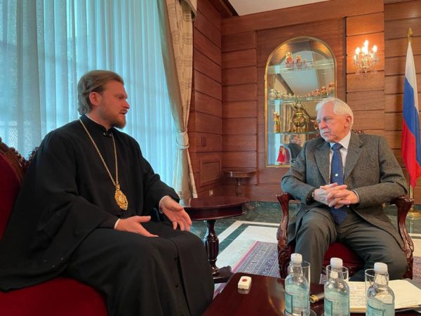 Правящий архиерей и глава дипломатической миссии обсудили ряд вопросов взаимодействия между Русской Православной Церковью Московского Патриархата и Посольством России в Чили. Также в ходе беседы были затронуты темы положения русскоговорящей диаспоры в стране.