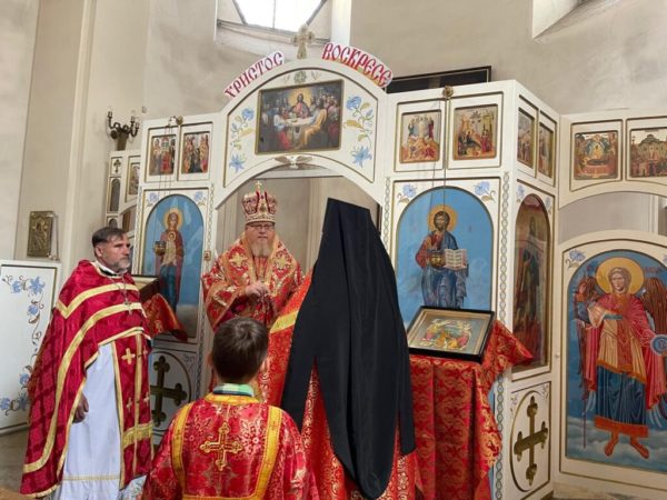 По окончании Литургии архиепископ Тихон с духовенством пропели стихиры Пасхи. Настоятель прихода иеромонах Косма приветствовал правящего архиерея и поблагодарил его за молитву и архипастырский визит в трудное для города и всего региона время.
