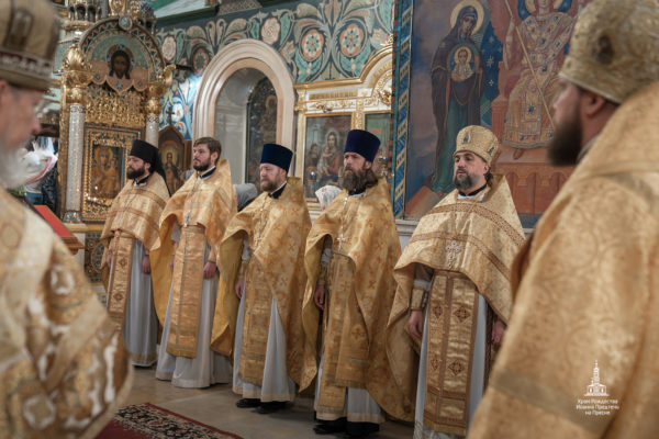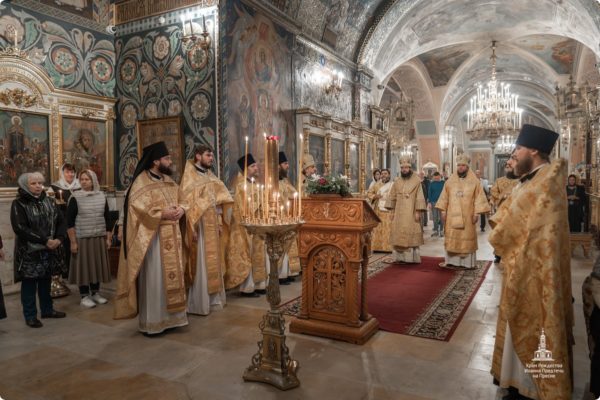 Иерархам сослужили: секретарь Патриарха Московского и всея Руси по г. Москве, благочинный Центрального благочиния протопресвитер Владимир Диваков; советник Патриарха Московского и всея Руси протоиерей Николай Балашов; начальник Русской духовной миссии в Иерусалиме архимандрит Вассиан (Змеев), заместитель председателя ОВЦС протоиерей Николай Лищенюк; помощник председателя ОВЦС иерей Александр Ершов; иерей Александр Волков; сотрудники ОВЦС иеромонахи Кирилл (Перегудин) и Марк (Ахматханов); клирики Иоанно-Предтеченского храма протоиерей Дионисий Лобов, иереи Максим Романов, Алексий Воронцов, Максим Бояров диаконы Евгений Кузнецов, Сергий Бобров, а также клирик Русской духовной миссии в Иерусалиме диакон Макарий Петухов.