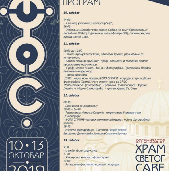 Први међународни фестивал фотографије “ФОС”, у организацији Храма Светог Саве, одржаће се у Београду од 10. до 13. октобра 2019. године. Више на плакату поред.
