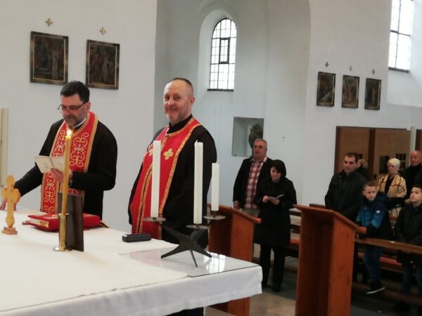 Вечерњу службу су служили протојереј Станко Ракић и протојереј-ставрофор Милорад Јовановић, надлежни парох, док су за певницом одговарали освештеник Бојан Симић из Минхена, др Роберт Длоухи и теолог Вартоломеј Тешић из Минхена.