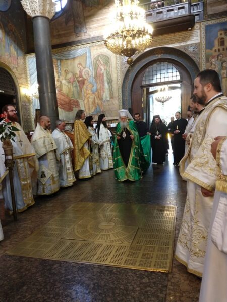 Днес тържествената света литургия отслужи Негово Светейшество Неофит, митрополит Софийски и патриарх Български, в съслужение с Негово Преосвещенство Мелнишки епископ Герасим, главен секретар на Св. Синод, Негово Преосвещенство еп. Поликарп, викарий на Софийския митрополит, архимандрит Василий, протосингел на Софийска света митрополия, храмовото духовенство, архим. Пахомий, ректор на Софийска духовна семинария и др.