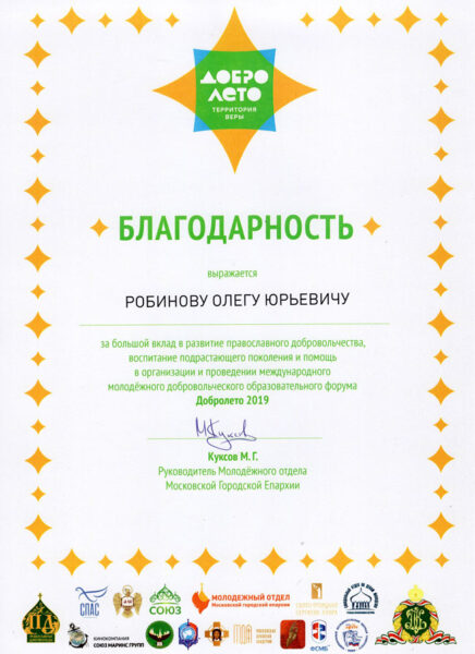 По окончании форума руководителю Молодёжной секции ИППО Олегу Робинову была объявлена благодарность за большой вклад в развитие православного добровольчества, воспитание подрастающего поколения и помощь в организации и проведении международного молодёжного добровольческого образовательного форума «Добролето» 2019 от руководителя Молодёжного отдела Московской городской епархии Михаила Куксова.