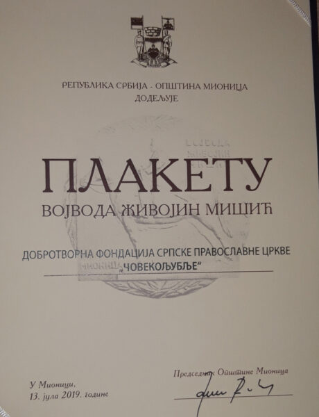 Том приликом председник општине Мионица г. Бобан Јанковић уручио је Велику златну плакету са ликом Живојина Мишића припадницима Војске Србије и Министарства одбране. Такође, додељене су и четири плакете са грбом општине Мионица, а једна од њих припала је Човекољубљу. Човекољубље је добило плакету Војвода Живојин Мишић за постигнуте резултате у области хуманитарних и донаторских активности на територији општине Мионица.