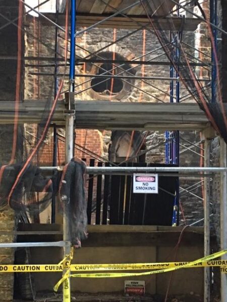 Његово Преосвештенство г. Иринеј је затим прегледао изградњу новог пода који се састоји од масивних, 27 инча дубоких, челичних греда, закованих са плочама од валовитог и полицинкованог челика дубоких 7 инча, на које ће се сипати цементна база премошћена елементима подног грејања и завршним слојем.