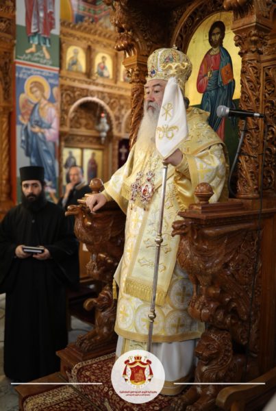 نَحنُ اليومَ ومن هذهِ الكنيسةِ الرّوميَّةِ الأرثوذكسيَّةِ نَستَذكِرُ الأجدادَ والآباءَ قَبلَ مِئة عَامٍ وفي مُقدِّمَتِهم المُثلَّثِ الرحماتِ بَطريرك القُدس ذِميانوس، الذي بايعَ الأميرَ الهَاشميَّ أمينًا على نفوسِ العِباد وعلى مُقدَّساتِ وأوقافِ المَسيحيّينَ والمُسلمين، ومن قَبلهِ المَغفورِ له الشريفُ الحُسين بن علي مَلك العرب، وهو الذي أَنشأَ العَلاقةَ الهَاشِميَّةَ التّاريخيَّةَ الوطيدَةَ بالكنيسةِ الأمِّ صَاحبةِ الأرض، بَطريركيَّةِ الرُومِ الأرثوذكسِ المَقدسيَّةِ التي هي المُؤسَّسَةُ الأولى في بلادِنَا المُقدّسَة، حيث كان أَوَّلَ أُسقفٍ عليها القدّيس يعقوب أخو الرَّبِّ سنةَ ثلاثةً وثلاثين ميلادي (٣٣ م)، وتوالى على كُرسيِّها المَقدسيّ مِئَةً وواحدًا واربعين ( ١٤١) بَطريركًا حتى يومِنا هذا، ليأتي الاستقلالُ في عَامهِ السّادس والسّبعينَ شَاهِدًا على دَيمومةِ قِصَّتِنا الأردنيّة، كَيفَ لا والوَصيُّ على أوقافِنا ومُقدَّساتِنا المَسيحيَّةِ والإسلاميَّةِ صَاحبُ الجلالةِ المَلك عبدالله الثّاني مُستمرٌ في تَحمُّلِ مَسؤولياتِهِ التّاريخيَّةِ تِجاه البلادِ والعِباد وتِجاهَ القِيامةِ والأقصى. نحنُ اليومَ هُنا مُصلّينَ ومُحتفلينَ بَينما تُقامُ أعمالُ التّرميمِ في أرضياتِ كنيسةِ القيامةِ بِدعمٍ وتَبرعٍ مِن جَلالة المَلك المُفدّى، ومِن قَبلُ أيضًا تَرميمُ قَبرِ السّيّدِ المَسيحِ في كنيسةِ القيامة.