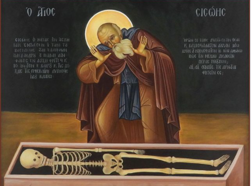 النص المكتوب في الإيقونة يخبر ما يحدث: “سيصوي، الناسك العظيم، أمام قبر الإسكندر، ملك اليونان، الذي كان مغمورًا بالمجد في وقت ما. منذهلاً، يندب تقلّبات الزمن وزوال المجد، ويخطب بدموع هكذا: “إن مجرّد رؤيتك أيّها القبر، ترعبني وتدفع قلبي لذرف الدموع، فيما أتأمّل في الدَين الذي علينا نحن جميع البشر. كيف لي أن أحتمل ذلك؟ أواه، أيّها الموت! مَن يستطيع أن ينجو منك؟”.