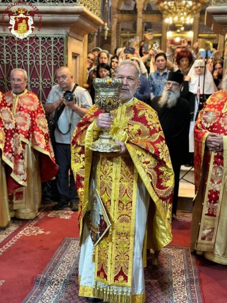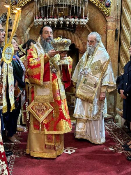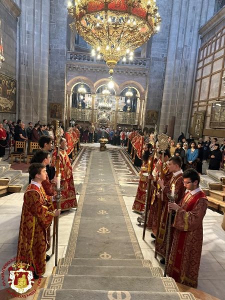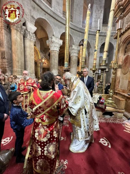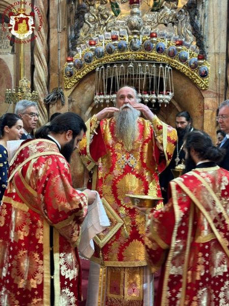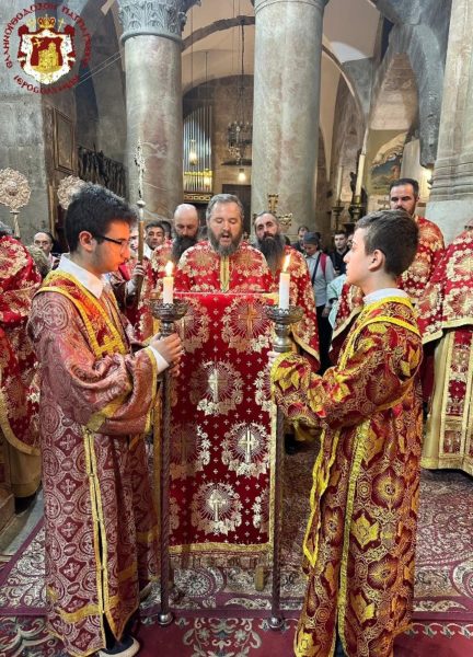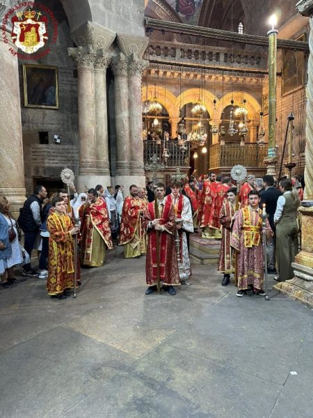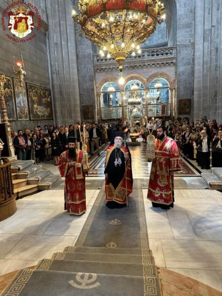 في هذه المناسبة أقيمت في القبر المقدس القابل الحياة في كنيسة القيامة خدمة القداس الإلهي ترأسها سيادة متروبوليت كابيتولياذا كيريوس إيسيخيوس يشاركه سيادة المتروبوليت يوانيكيوس من كنيسة الجبل الأسود, سيادة رئيس أساقفة قطر كيريوس مكاريوس وآباء من أخوية القبر المقدس. قاد الترتيل سيادة رئيس أساقفة مادبا كيريوس أريستوفولوس والشماش المتوحد الأب سيميون, بحضور القنصل اليوناني العام في القدس ومصلين وحجاج من البلاد وخارجها.