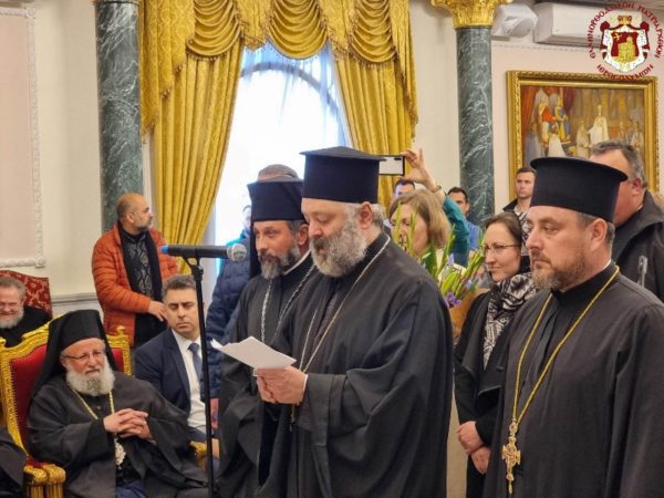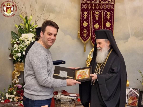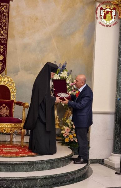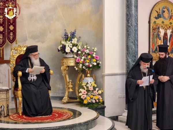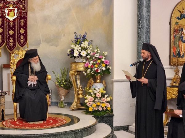 بعدها توجه صاحب الغبطة مع الآباء الى قاعة البطريركية للتهنئة, وقرأ سيادة المطران أريسترخوس السكرتير العام للبطريركية نيابة عن أخوية القبر المقدس كلمة تهنئة لغبطة البطريرك بعيد إسمه وشفيعه. القنصل اليوناني العام السيد فليوراس هنأ صاحب الغبطة بكلمة القاها نيابة القنصلية, تبعها كلمات تهنئة من ألاساقفة ووكلاء البطريركية والكهنة وممثلي الكنائس ألاورثوذكسية.