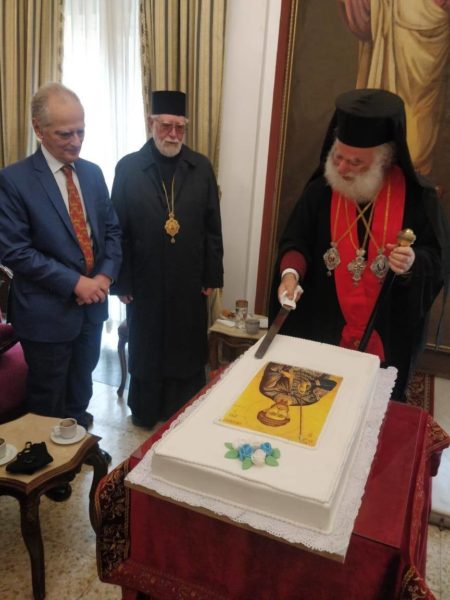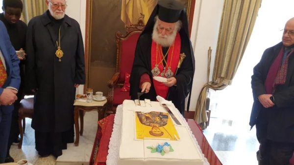 وبعد القداس الإلهي استقبل البابا ثيودوروس في قاعة مبنى مقر الدير المهنئين له بعيد شفيعه وقطع صاحب الغبطة التورتة التي رسم عليها صورة شفيعه.