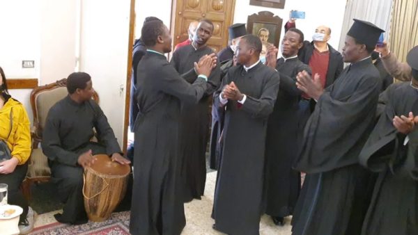 كما احتفل بغبطته طلاب مدرسة القديس أثناسيوس للأفارقة بالطبول على عادة بلادهم.