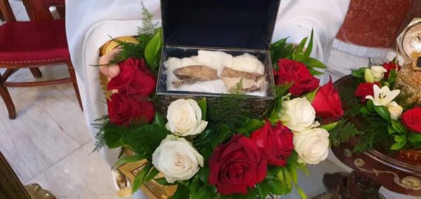 وخلال القداس الإلهي قدم الأرشمندريت الأب دامسكينوس الأزراعي رئيس الدير إلى البابا ثيودروس الثاني جزء من رفات القديس ثيودروس التيروني.