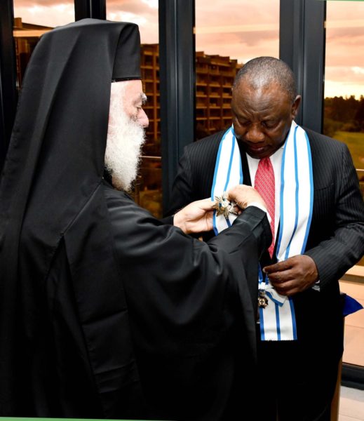 التقى البابا ثيودروس في جوهانسبرغ برئيس جمهورية جنوب إفريقيا السيد Cyril Ramaphosa. وشكر صاحب الغبطة الرئيس على الترحيب الحار الذي خصه به، وعلى دعمه لعمل الكنيسة.