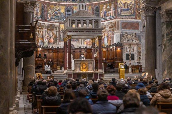 خاطب السيد/ أندريا ريكاردي مؤسس الجماعة والسيد/ ماركو إمباجليازو الوزير الأسبق ورئيسها صاحب الغبطة، حيث أكد على أهمية زيارة رئيس أساقفة الإسكندرية وبابها وبطريركها إلى مقر أسقف روما المشيخية.