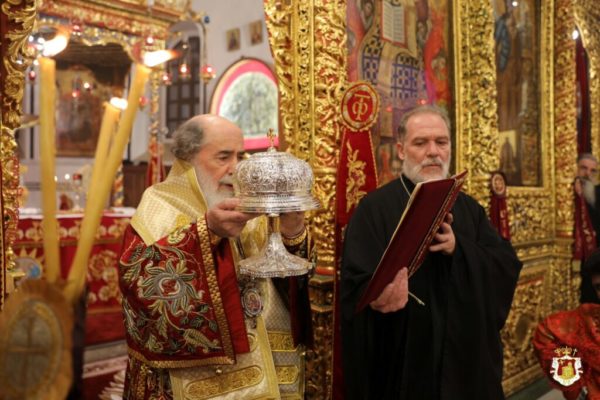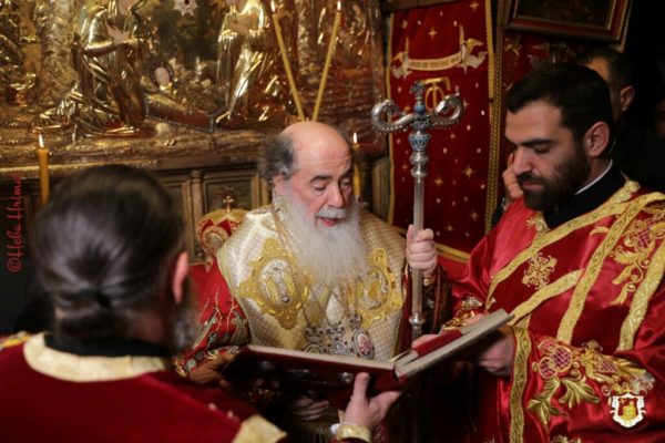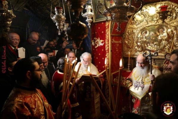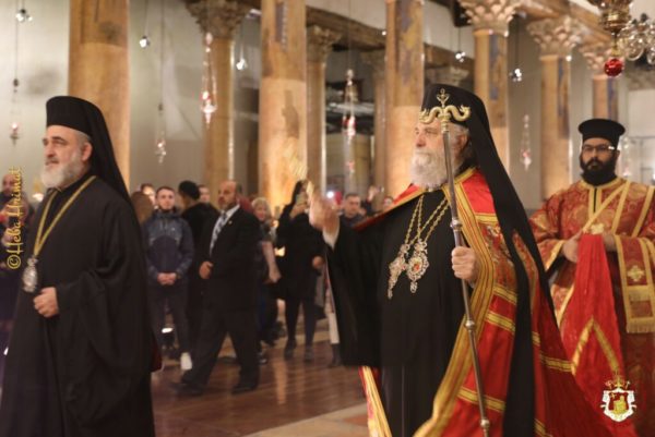 في هذا المكان المقدس ونيابة عن غبطة بطريرك المدينة المقدسة كيريوس كيريوس ثيوفيلوس الثالث, قام سيادة رئيس اساقفة قسطنطيني اريسترخوس بقراءة رسالة غبطة البطريرك ثيوفيلوس الثالث بمناسبة عيد الميلاد باللغة اليونانية وقدس الاب عيسى مصلح بقراءة الرسالة باللغة العربية.