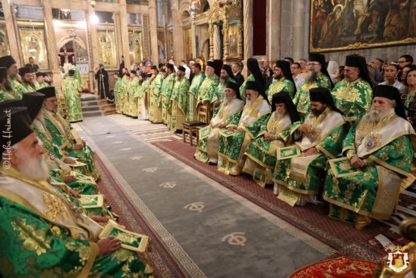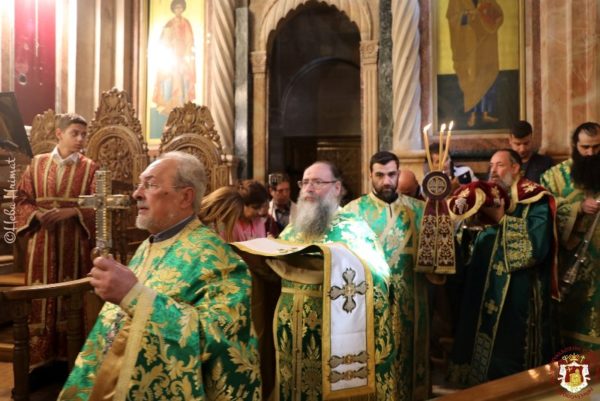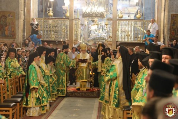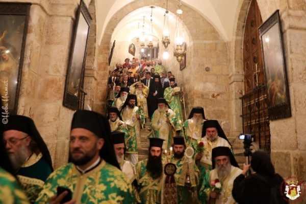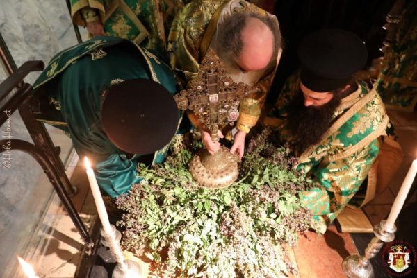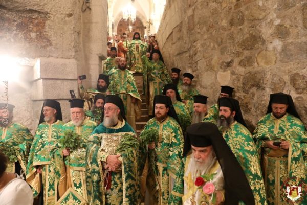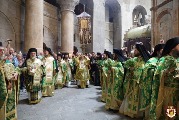 عشية العيد أقيمت خدمة صلاة الغروب الكبير في كنيسة الكاثوليكون في كنيسة القيامة. صباح يوم العيد ترأس غبطة البطريرك كيريوس كيريوس ثيوفيلوس الثالث القداس الإلهي الإحتفالي بمشاركة أصحاب السيادة متروبوليت كابيتولياذا كيريوس إيسيخيوس, متروبوليت البصرى كيريوس ثيموثيوس, من الكنيسة اليونانية متروبوليت كسانثي كيريوس بانديلايمون, متروبوليت كومونيتي كيريوس بانديلايمون, رئيس أساقفة جرش كيريوس ثيوفانيس, رئيس أساقفة قسطنطيني كيريوس أريسترخوس, رئيس أساقفة طابور كيريوس ميثوذيوس, رئيس أساقفة سبسطية كيريوس ثيوذوسيوس, رئيس أساقفة اللد كيريوس ذيميتريوس, رئيس أساقفة أنثيذون كيريوس نيكتاريوس, سيادة المطران بارثينيوس من أسقفية أوهريد (تتبع البطريركية الصربية), وآباء أخوية القبر المقدس وآباء من كنائس أورثوذكسية شقيقة. قاد خورس الترتيل الأب سيميون سكرتير المجمع المقدس والسيد باسيليوس غوتسوبولوس بمشاركة طلاب المدرسة البطريركية. وحضر القداس الإلهي القنصل اليوناني العام السيد إيفانجيلوس فاليوراس وحشد من المصلين من البلاد وخارجها.