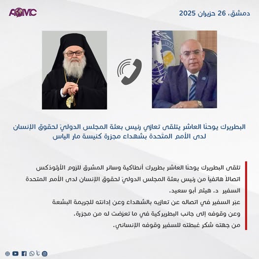 تلقى البطريرك يوحنا العاشر بطريرك أنطاكية وسائر المشرق للروم الأرثوذكس اتصالاً هاتفياً من رئيس بعثة المجلس الدولي لحقوق الإنسان لدى الأمم المتحدة السفير د. هيثم أبو سعيد. عبر السفير في اتصاله عن تعازيه بالشهداء وعن إدانته للجريمة البشعة وعن وقوفه إلى جانب البطريركية في ما تعرضت له من مجزرة. من جهته شكر غبطته للسفير وقوفه الإنساني.