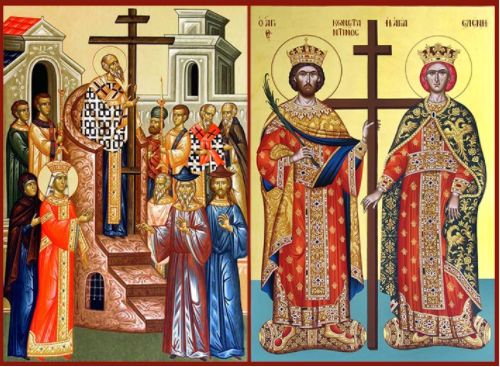 ١- نعاين الصليب مرفوعًا وعن يمينه ويساره القدّيسان قسطنطين وأمّه هيلانة فهما من سعيا لاسترجاع عود الصليب المكرّم.