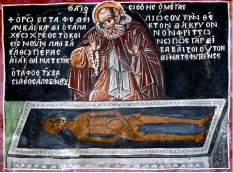 النص المكتوب في الإيقونة يخبر ما يحدث: “سيصوي، الناسك العظيم، أمام قبر الإسكندر، ملك اليونان، الذي كان مغمورًا بالمجد في وقت ما. منذهلاً، يندب تقلّبات الزمن وزوال المجد، ويخطب بدموع هكذا: “إن مجرّد رؤيتك أيّها القبر، ترعبني وتدفع قلبي لذرف الدموع، فيما أتأمّل في الدَين الذي علينا نحن جميع البشر. كيف لي أن أحتمل ذلك؟ أواه، أيّها الموت! مَن يستطيع أن ينجو منك؟”.