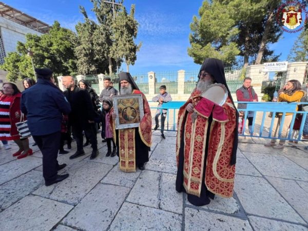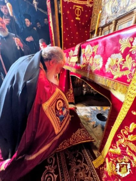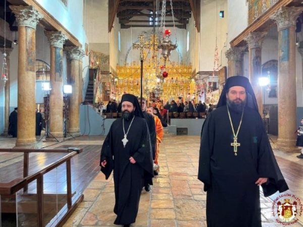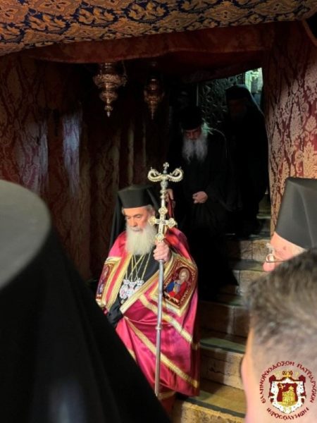 من ساحة كنيسة المهد توجه صاحب الغبطة مع الأساقفة والكهنة الى باب بازيليكا كنيسة المهد مرتلين “ميلادك أيها المسيح إلهنا” و “المسيح ولد فمجدوه”, حيث كان في إستقباله هناك القنصل العام لليونان ثم توجه الوفد البطريركي الى داخل كنيسة المهد الى القاعه الملوكيه عابرا من الباب الصغير للكنيسة.
