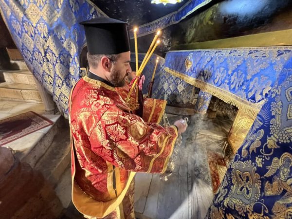 من القاعة الملوكية في الكنيسة عبرغبطة البطريرك مع الاساقفة والكهنة وتوجهوا يمينا من ناحية الايقونسطاس عند كنيسة القديس نيقولاوس الصغيرة الى مغارة الولادة الموضع الذي ولد فيه المخلص يسوع المسيح, وتم السجود والصلاة من قبل البطريرك والاساقفه والكهنة. بعد ذلك بدأت صلاة الغروب الكبرى لعيد الميلاد المجيد ترأسها غبطة البطريرك يشاركه الأساقفة والآباء. خدمة صلاة الغروب حسب الوضع الراهن المعمول به تنتهي عند الساعة 3:30 ظهراً.