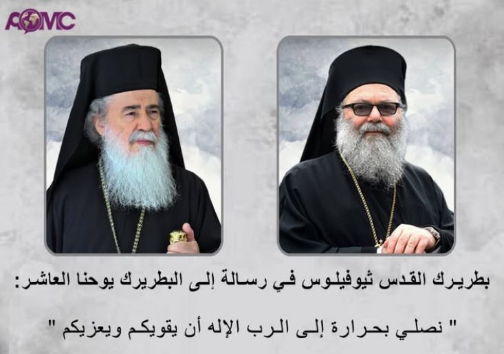 توجه بطريرك القدس وسائر فلسطين ثيوفيلوس الثالث برسالة أخوية إلى البطريرك يوحنا العاشر بطريرك أنطاكية وسائر المشرق للروم الأرثوذكس. عبّر غبطته فيها عن وقوفه وتضامنه مع الكنيسة الأنطاكية في ضوء ما يجري في سوريا. وأكد غبطته أن الكنيسة المقدسية تقف إلى جانب الشعب السوري وإلى جانب البطريركية الأنطاكية وأنها تصلي إلى الرب الإله “أن يقويكم ويعزيكم”.